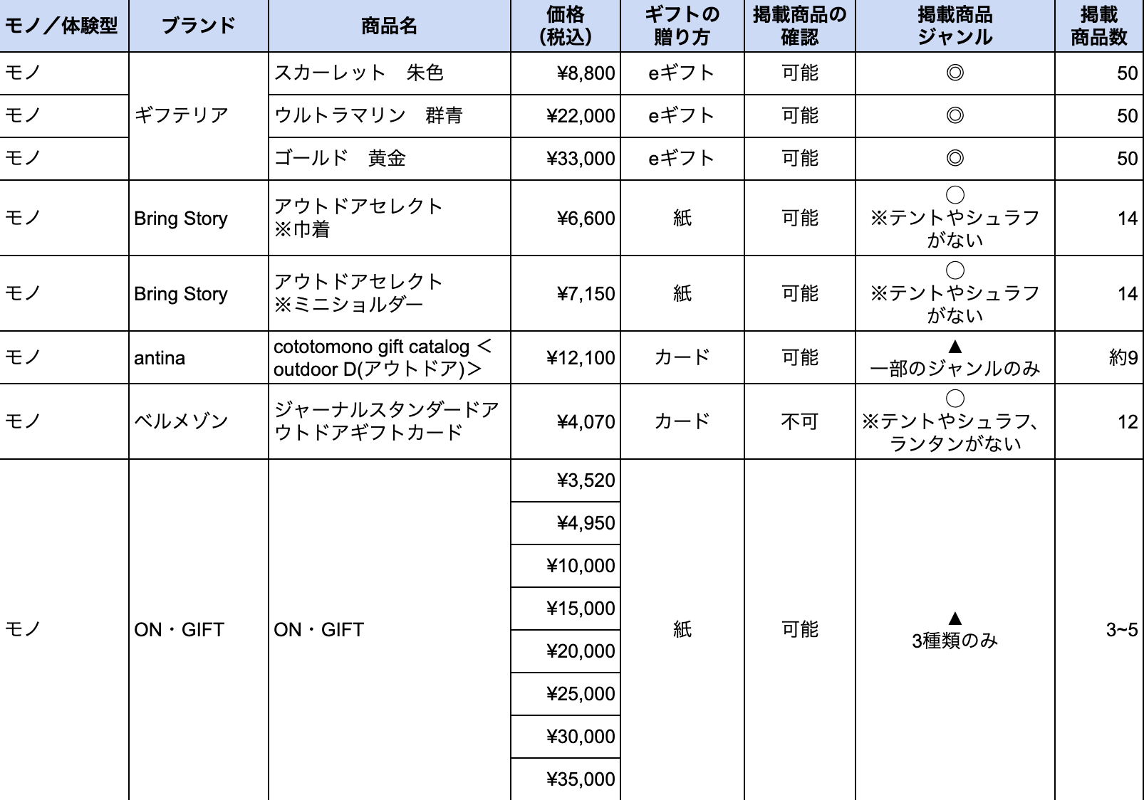 モノ/体験型 ブランド 商品名 "価格 (税込)" "ギフトの 贈り方" 掲載商品の確認 "掲載商品 ジャンル" "掲載 商品数" モノ ギフテリア スカーレット 朱色 ¥8,800 eギフト 可能 ◎ 50 モノ ウルトラマリン 群青 ¥22,000 eギフト 可能 ◎ 50 モノ ゴールド 黄金 ¥33,000 eギフト 可能 ◎ 50 モノ Bring Story "アウトドアセレクト ※巾着" ¥6,600 紙 可能 "◯ ※テントやシュラフがない" 14 モノ Bring Story "アウトドアセレクト ※ミニショルダー" ¥7,150 紙 可能 "◯ ※テントやシュラフがない" 14 モノ antina cototomono gift catalog <outdoor D(アウトドア)> ¥12,100 カード 可能 "▲ 一部のジャンルのみ" 約9 モノ ベルメゾン ジャーナルスタンダードアウトドアギフトカード ¥4,070 カード 不可 "◯ ※テントやシュラフ、ランタンがない" 12 モノ ON・GIFT ON・GIFT ¥3,520 紙 可能 "▲ 3種類のみ" 3~5 ¥4,950 ¥10,000 ¥15,000 ¥20,000 ¥25,000 ¥30,000 ¥35,000 体験型 EXCITING Gift EXCITING Gift ¥11,930 eギフトor紙 可能 ◎ 68 ¥23,650 eギフトor紙 可能 ◎ 113 ¥34,590 eギフトor紙 可能 ◎ 84 体験型 SOW EXPERIENCE 体を動かす楽しみギフト ¥11,880 紙 可能 ◎ 176